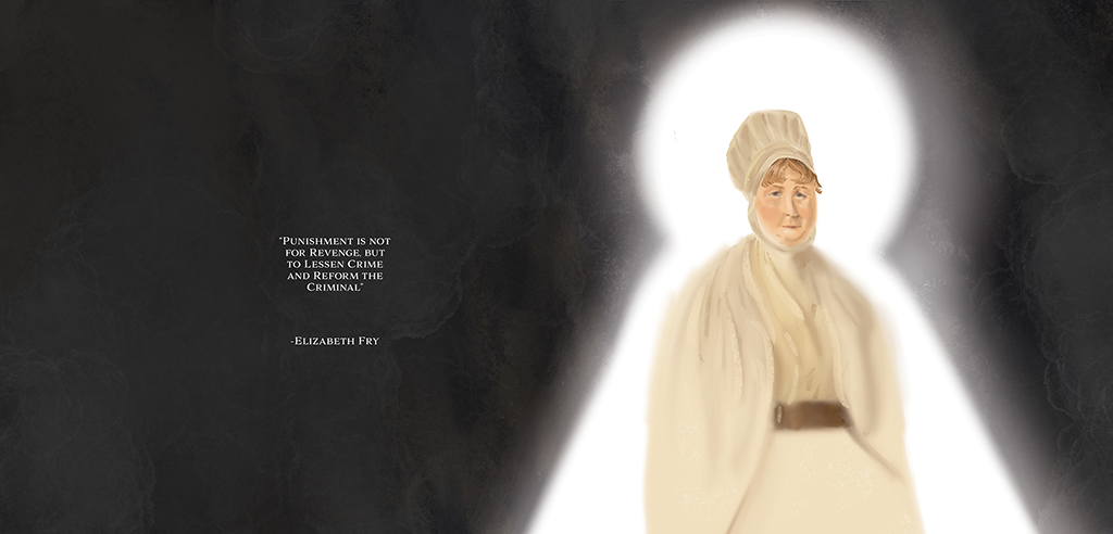 Researching Elizabeth Fry and finding out about how she paved the wave for reforming the prison system. I wanted to show the cold uncaring system and it’s bars being reshapes then presenting Fry as a figure with depth and authority, appearing through a keyhole as the resolution.