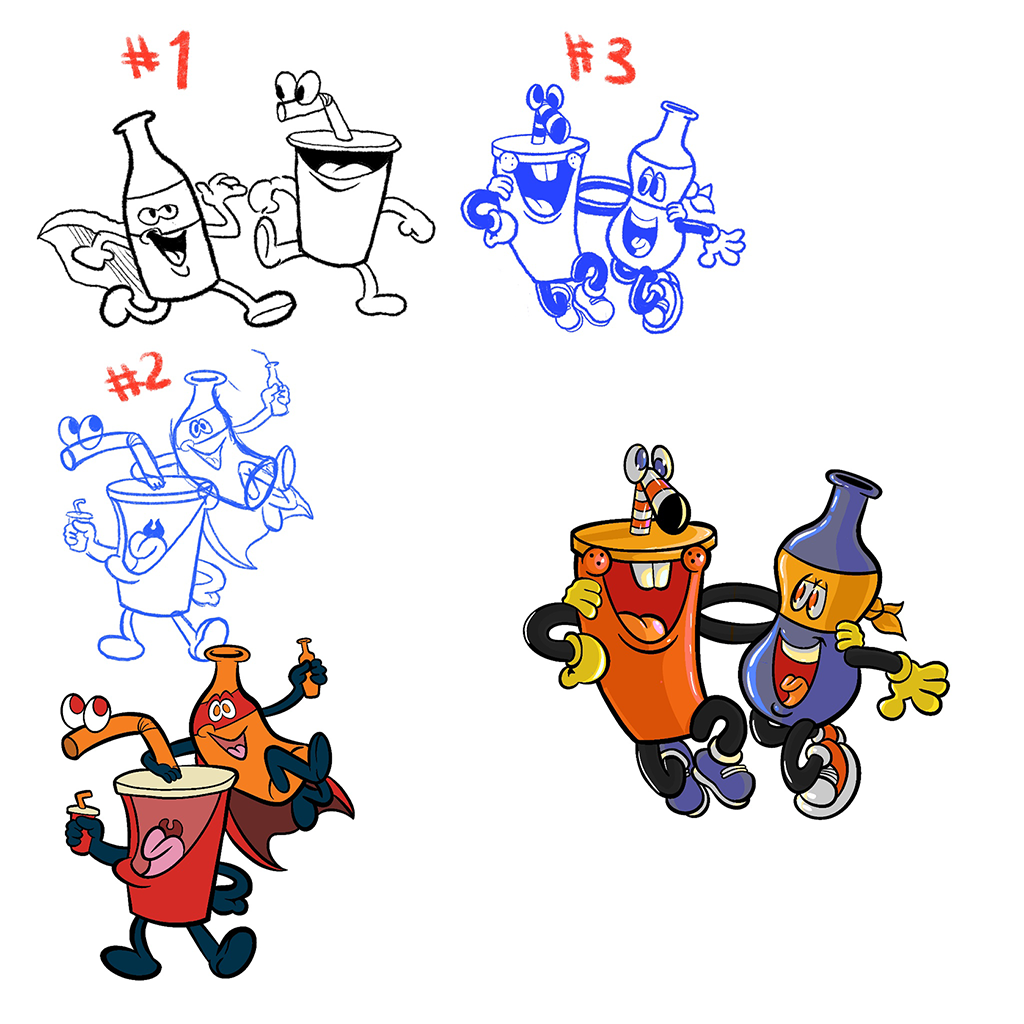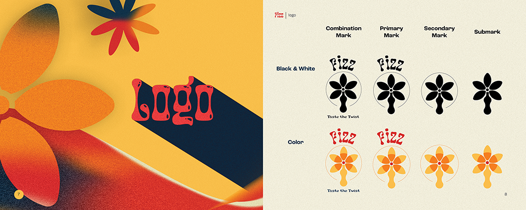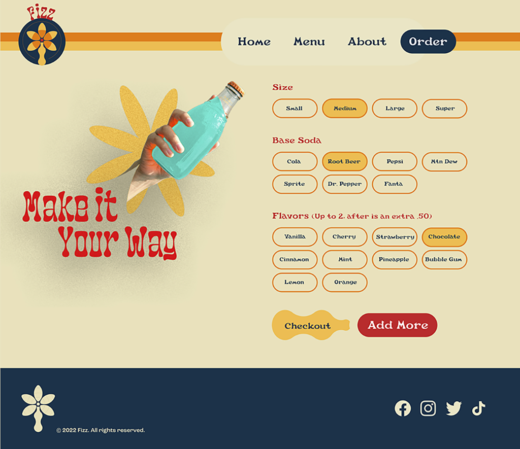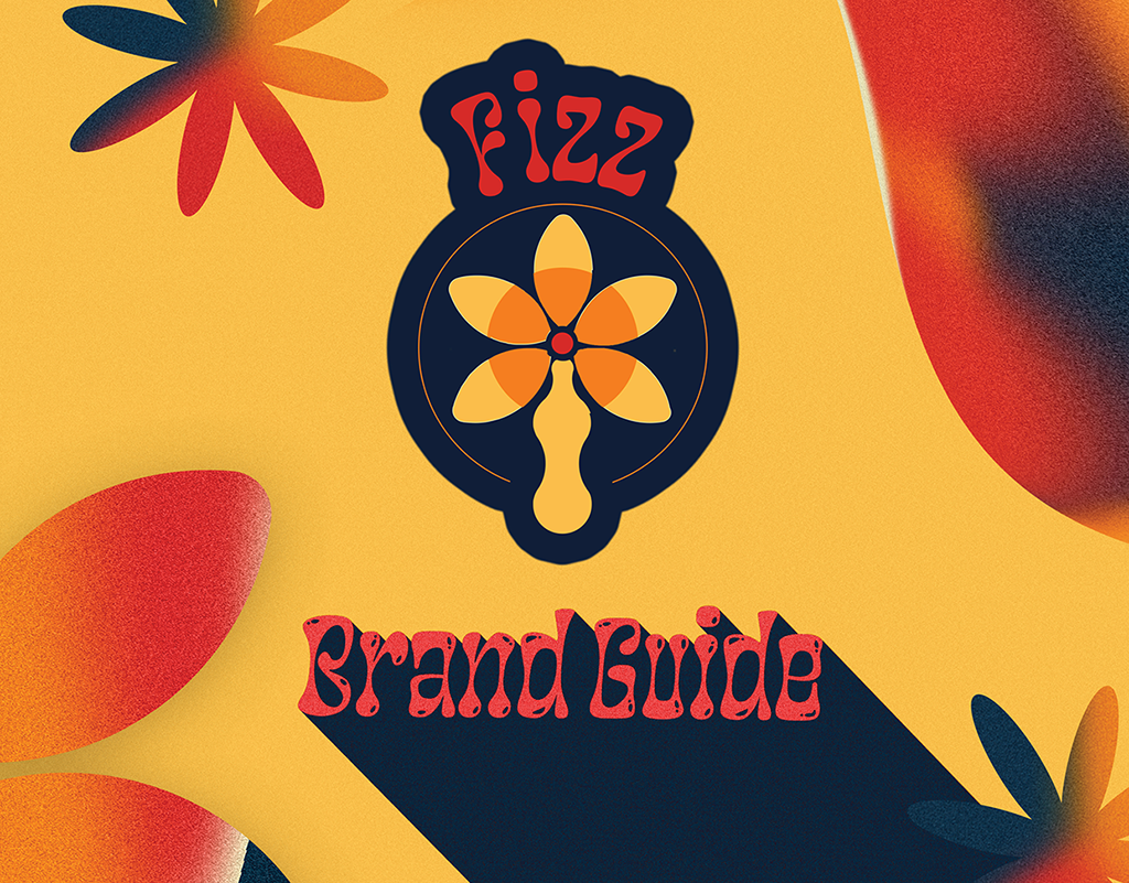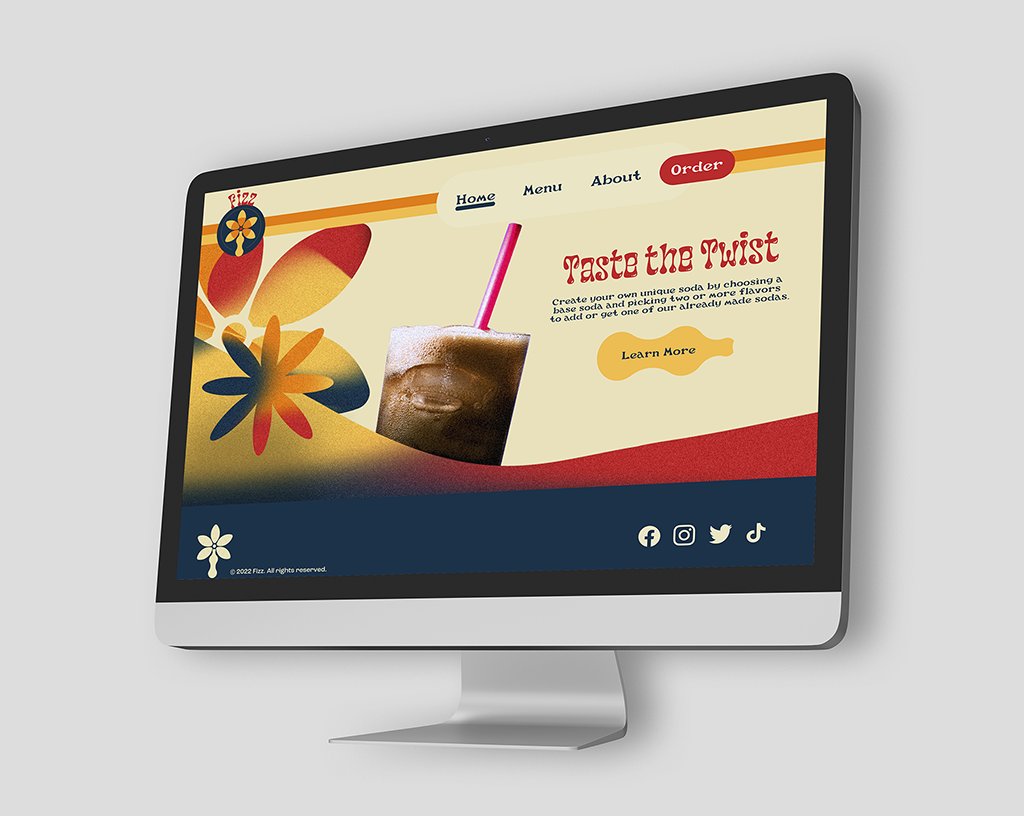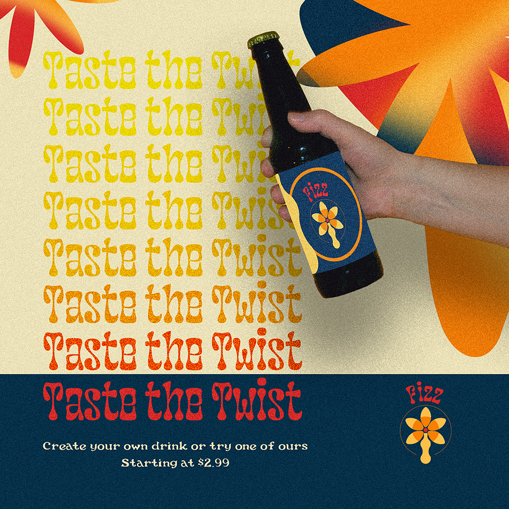 Another student gave the idea of a custom soda shop. The details given were the name Fizz, the motto “Taste the Twist” and wanting a funky 70s theme. Using those prompts, I wanted to really focus on a fun and colorful brand with organic curves and shapes heavily incorporated in the style.