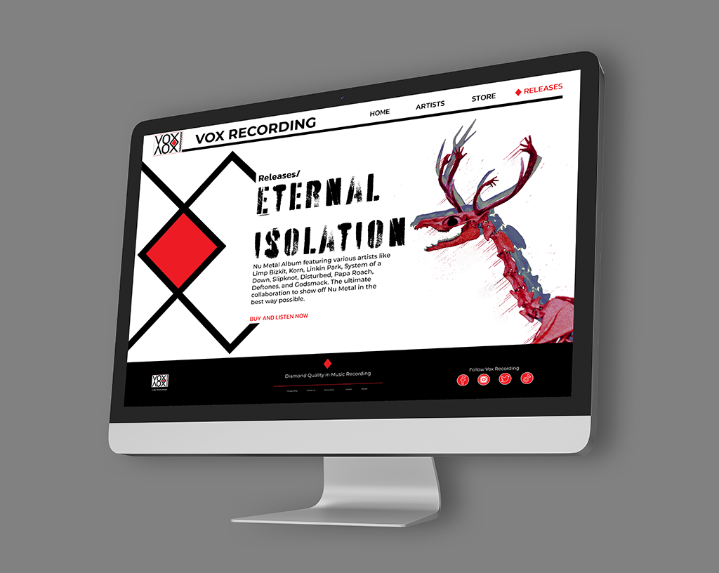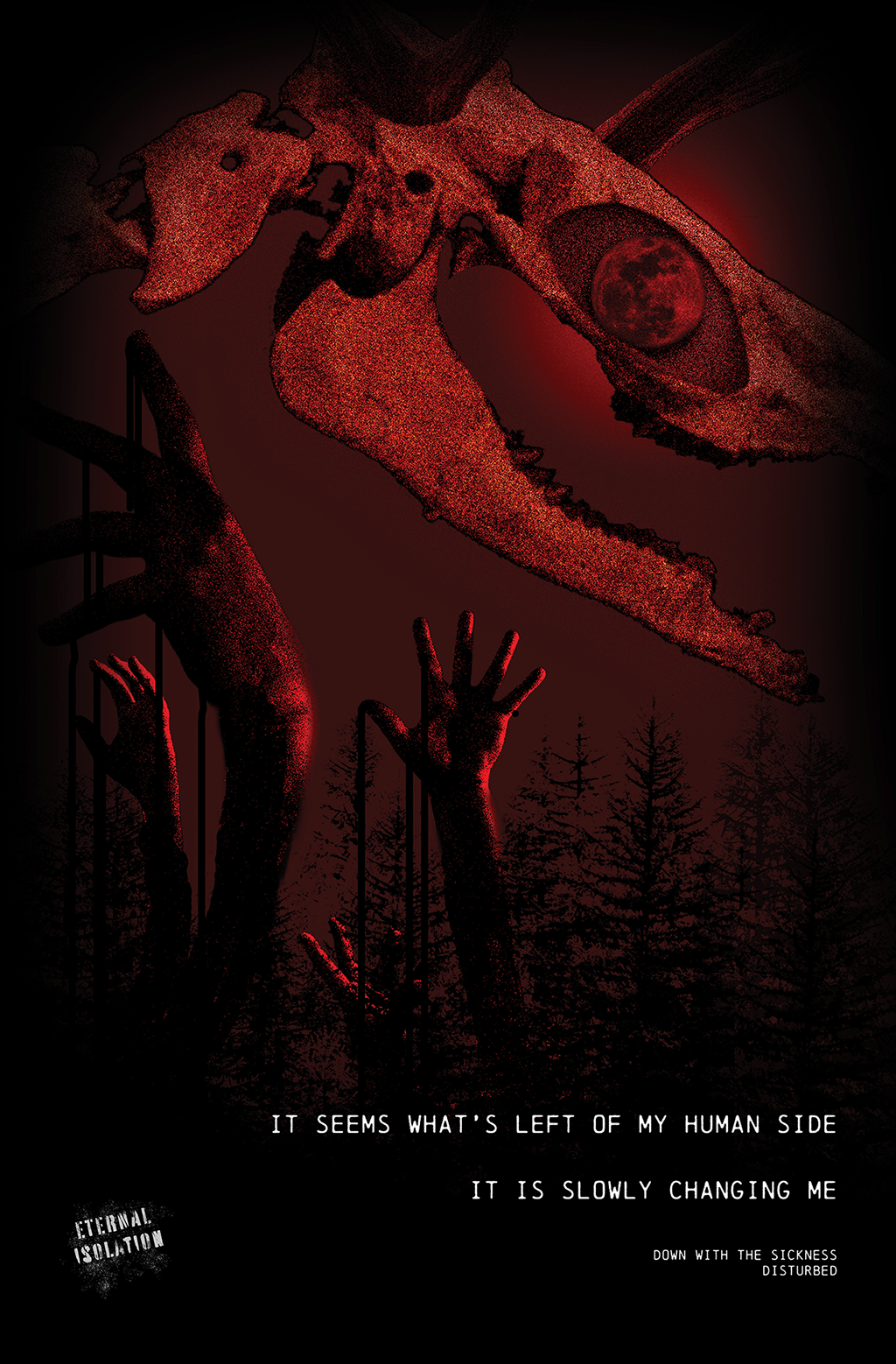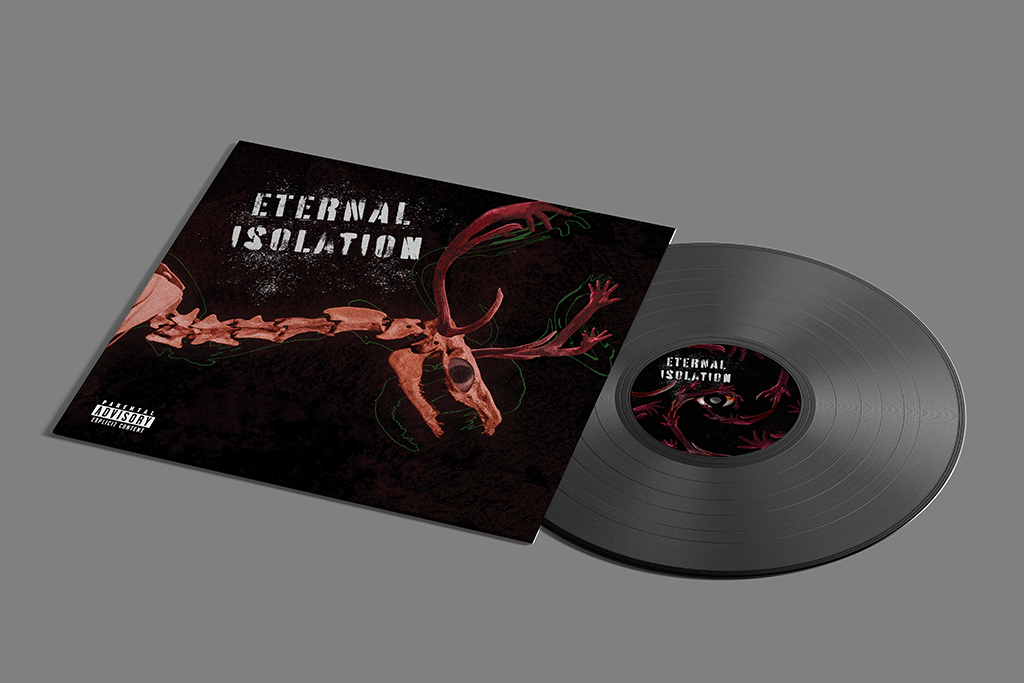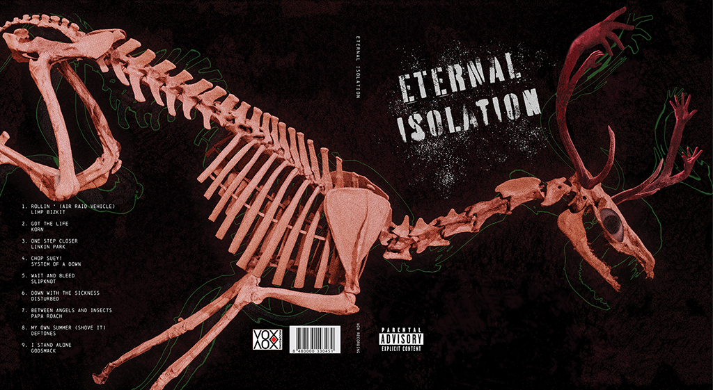 Listening to an unfamiliar genre “Nu Metal”, I took note of the themes and tones and pulled out a sense of isolation. Thinking on an old folklore tale of a person who is isolated from society becoming a “Wendigo”, a deer-like monster. Then using Nu Metal grunge tropes in my own way.